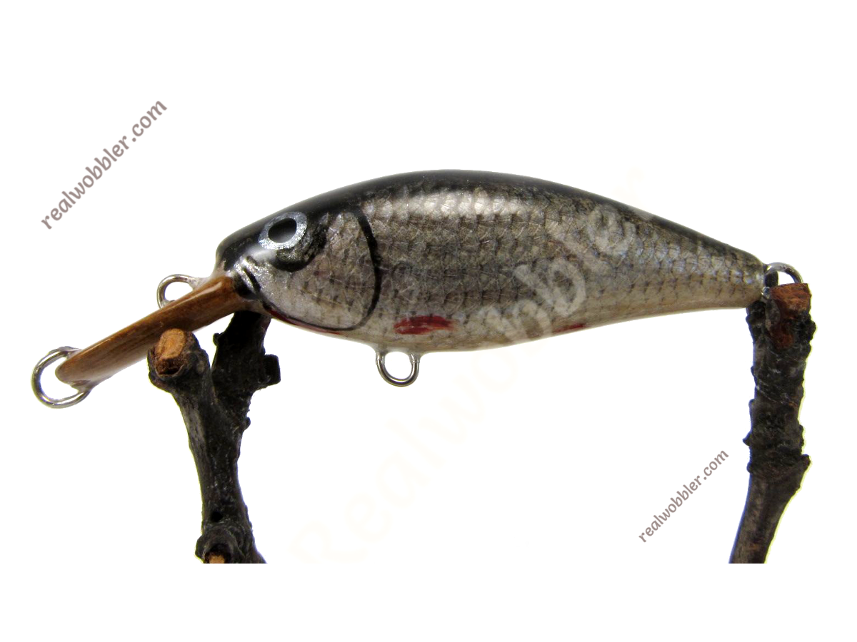 This lure is a completely handcrafted unique masterpiece and is the only existing one in the world with these features: shape, weight, swimming action, hand painting, fish skin. Its body is elaborated from durable poplar wood; what is more, it is covered by real fish skin from Common rudd. To ensure its excellent swimming action, it has been tested in a river, under the influence of the natural water and environment.
